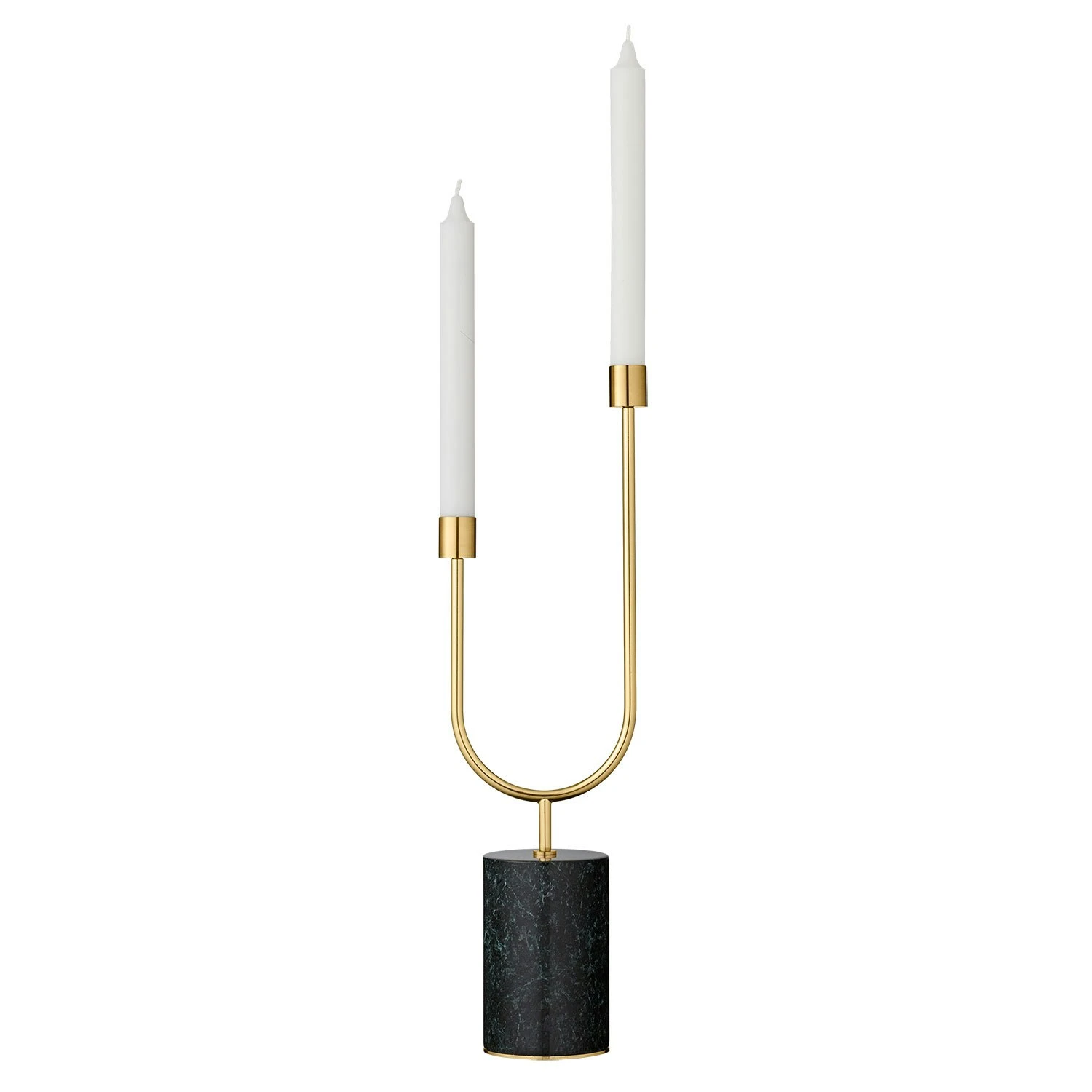 Grasil is a majestic candle holder from Danish AYTM. With a heavy base of green marble and stately candle holders in brass plated iron, this candle holder becomes a centerpiece of the room. With candles, it is around half a meter high. Grasil is also available in a lower wider variant with a black foot.