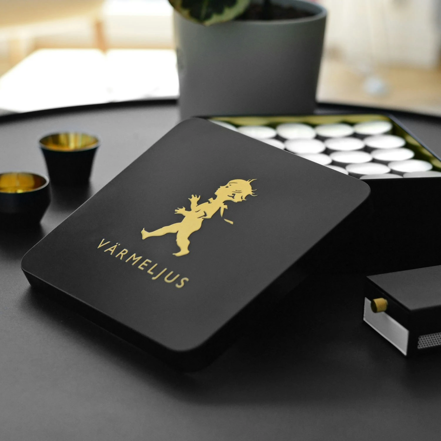 Practical tin jar from Solstickan that is perfect for storing tealights. It has a decorative design, and the top is adorned with the classic Solstickan boy.
