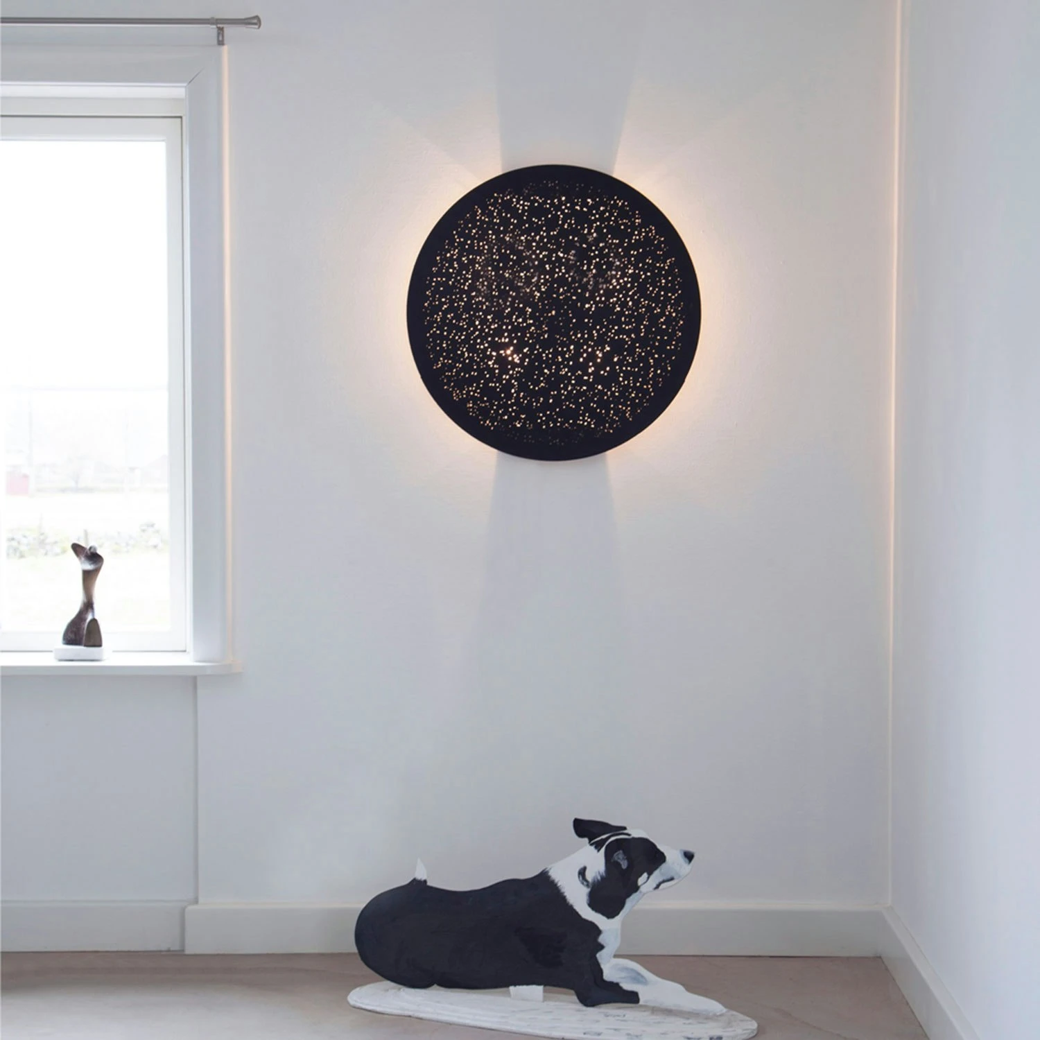The round lamp shape is made out of metal with small perforated holes that allows the light to transpire and thus create a moody light. Colby Wall light is available in three different colors – black, white and gold. Combine with Colby table lamp in the same color. For Colby Wall light you need 4 light bulbs with E14 socket.