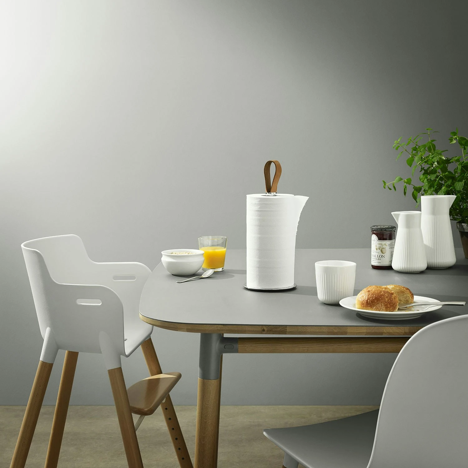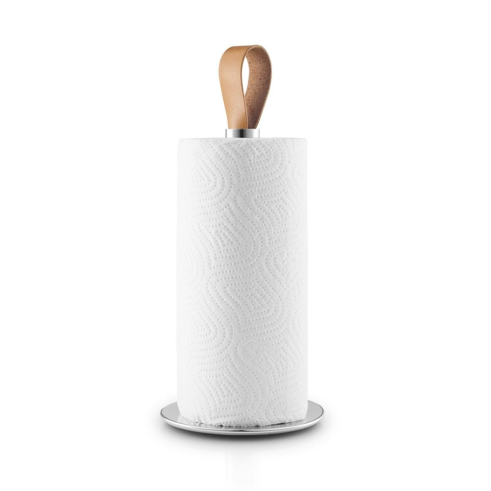 Kitchen roll holder from Eva Solo. This holder is made of stainless steel and has a decorative strap in leather that makes it easy to move. It is practical to use thanks to the rubber-coated bottom with extra weight, which makes it stable and prevents scratches on the surface.