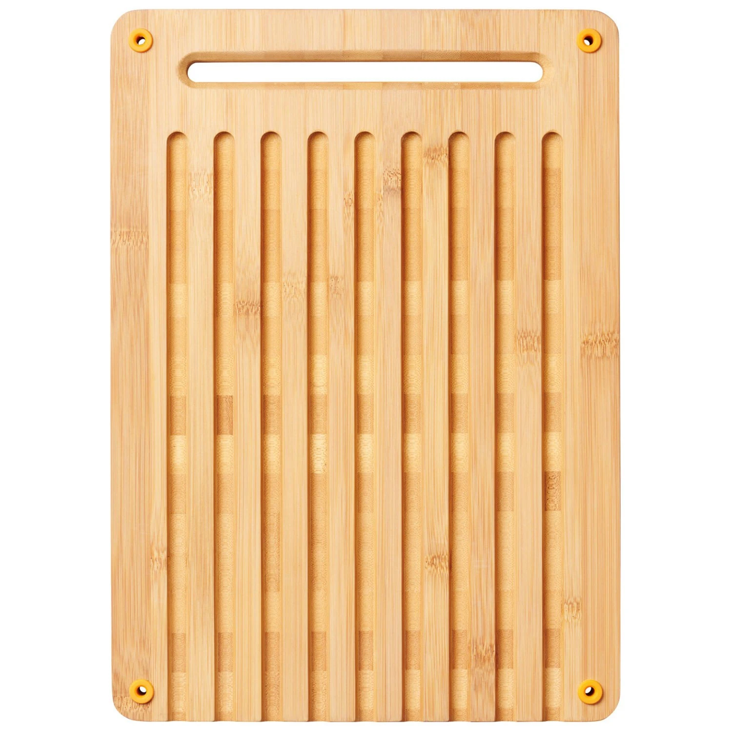 The cutting board by Fiskars is made of beautiful bamboo with a double sided design for all occasions. The cutting board has a notched surface on the front for bread with a smooth surface on the back. It has a broad hole at the top for easy suspension.