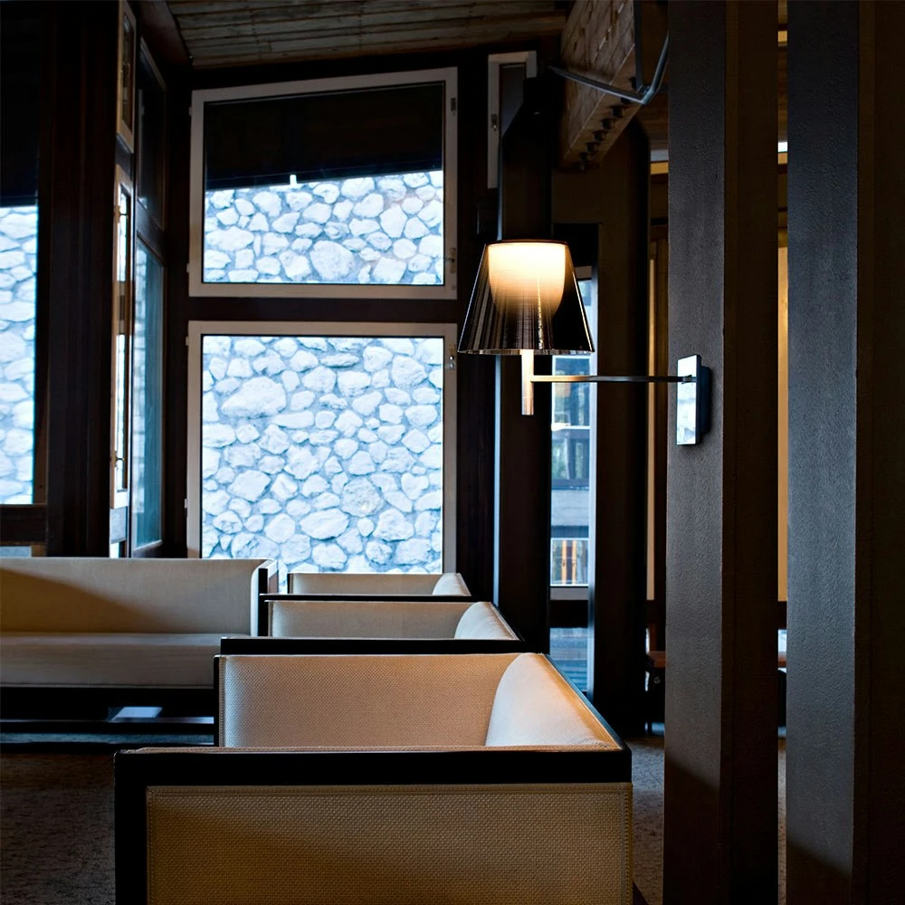 Ktribe W wall lamp from Flos. A beautiful classic wall lamp with modern touches designed by Phillippe Starck. The lamp has double screens, an interior in opal-toned polycarbonate and an outer, flared transparent screen. K Tribe provides a soft and comfortable light that is also adjustable with a dimmer.