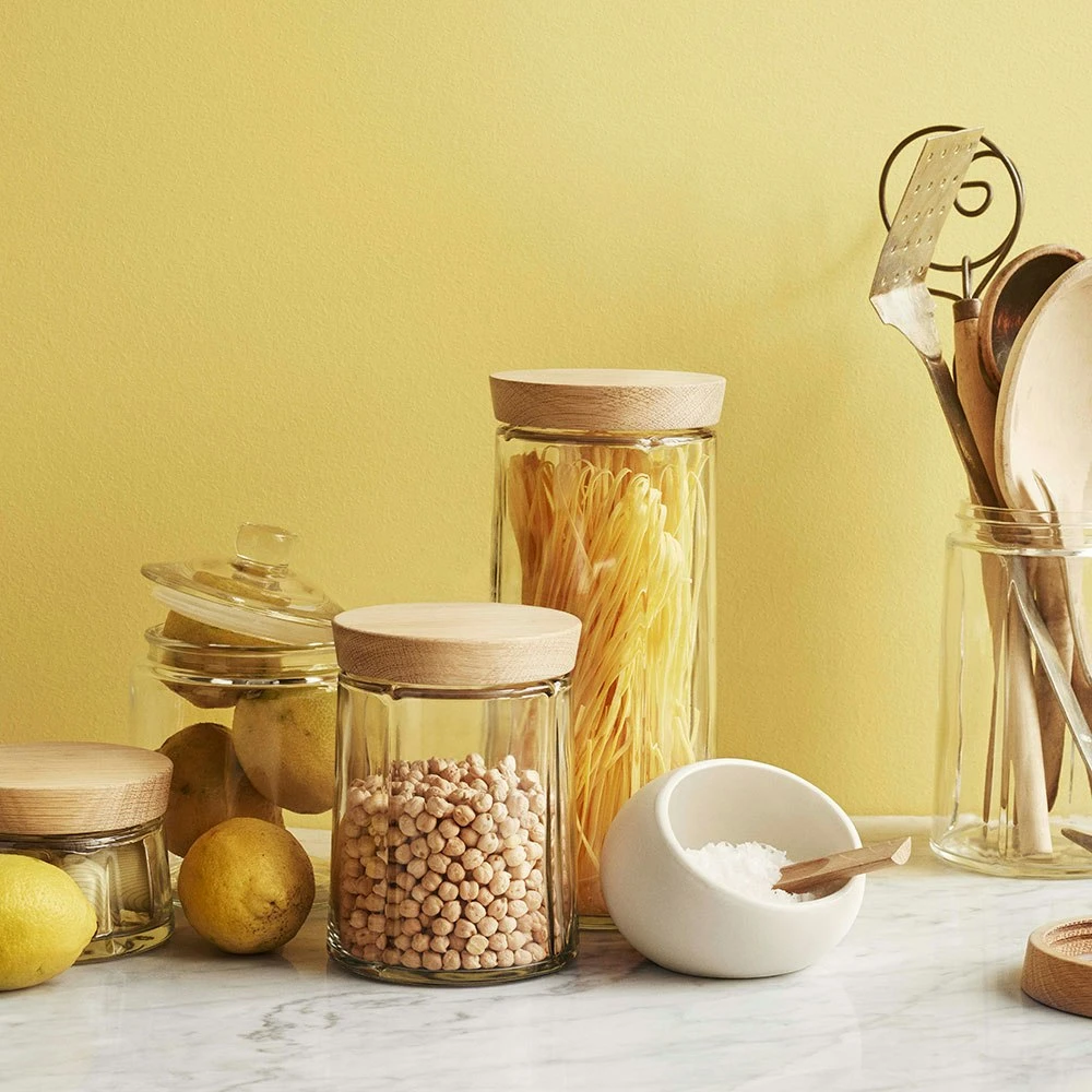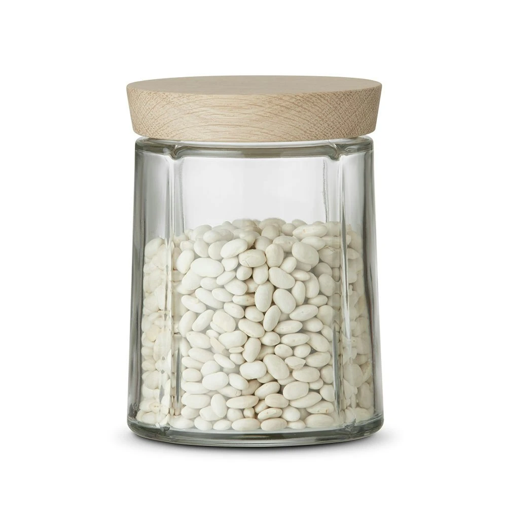 Here you have the solution for storage in the kitchen. Made of lead-free glass with a lid in European oak that closes tightly thanks to the silicone ring. Dishwasher safe. 55°C (but not the wood lid). The storage jar come in several sizes.