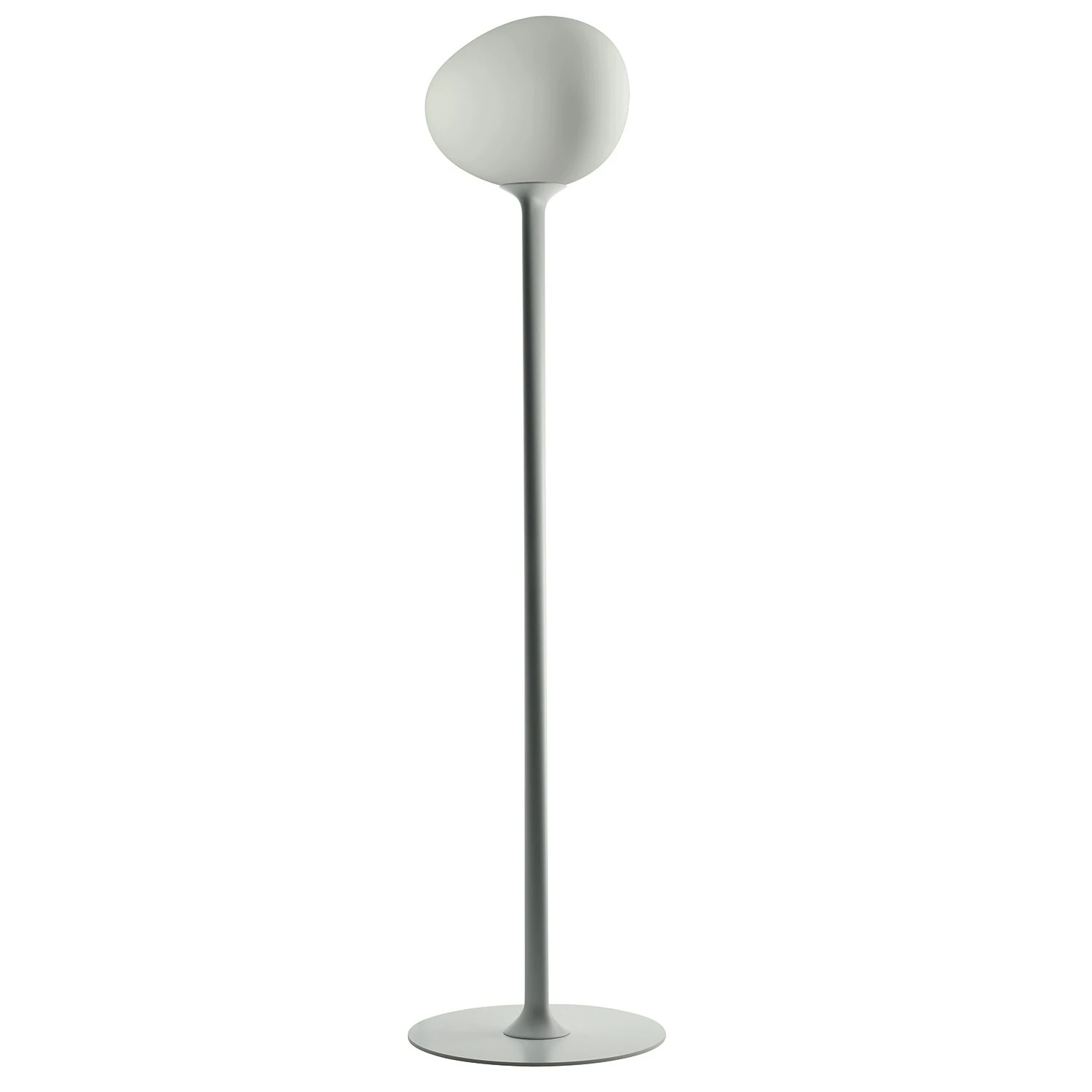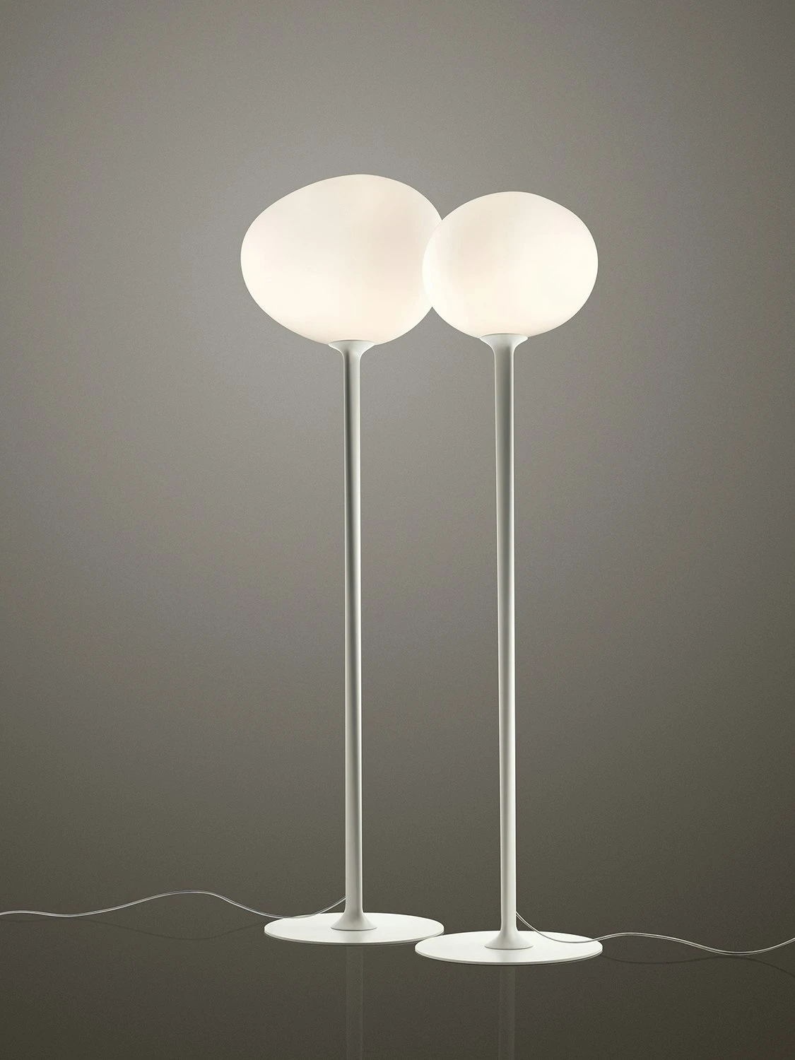 Gregg floor lamp from Foscarini. Designed by designer couple Ludovica and Roberto Palomba. It comes in two sizes where the larger model measures 185 cm in height and the intermediate variant 168 cm. The round, but slightly asymmetrical ball is made of blown acid-etched glass. The frame is made of lacquered polyurethane and metal. With the help of a built-in dimmer you can easily adjust the brightness as needed. The Gregg series also consists of table lamps, ceiling lamps and floor lamps of various sizes. Available in two different colors.