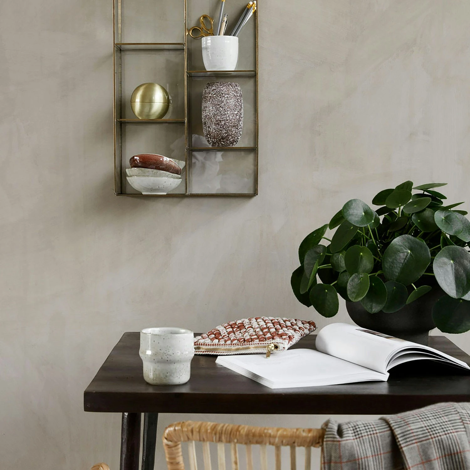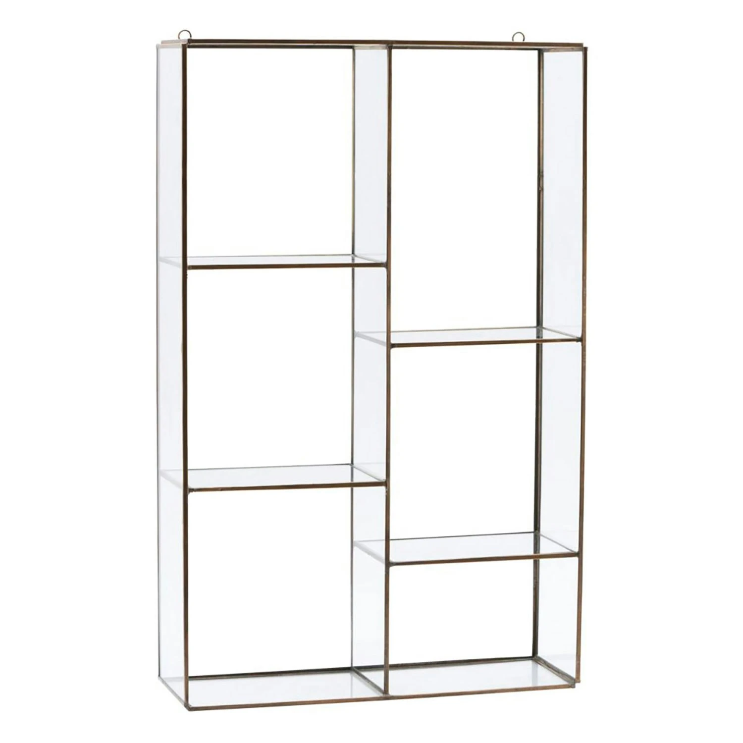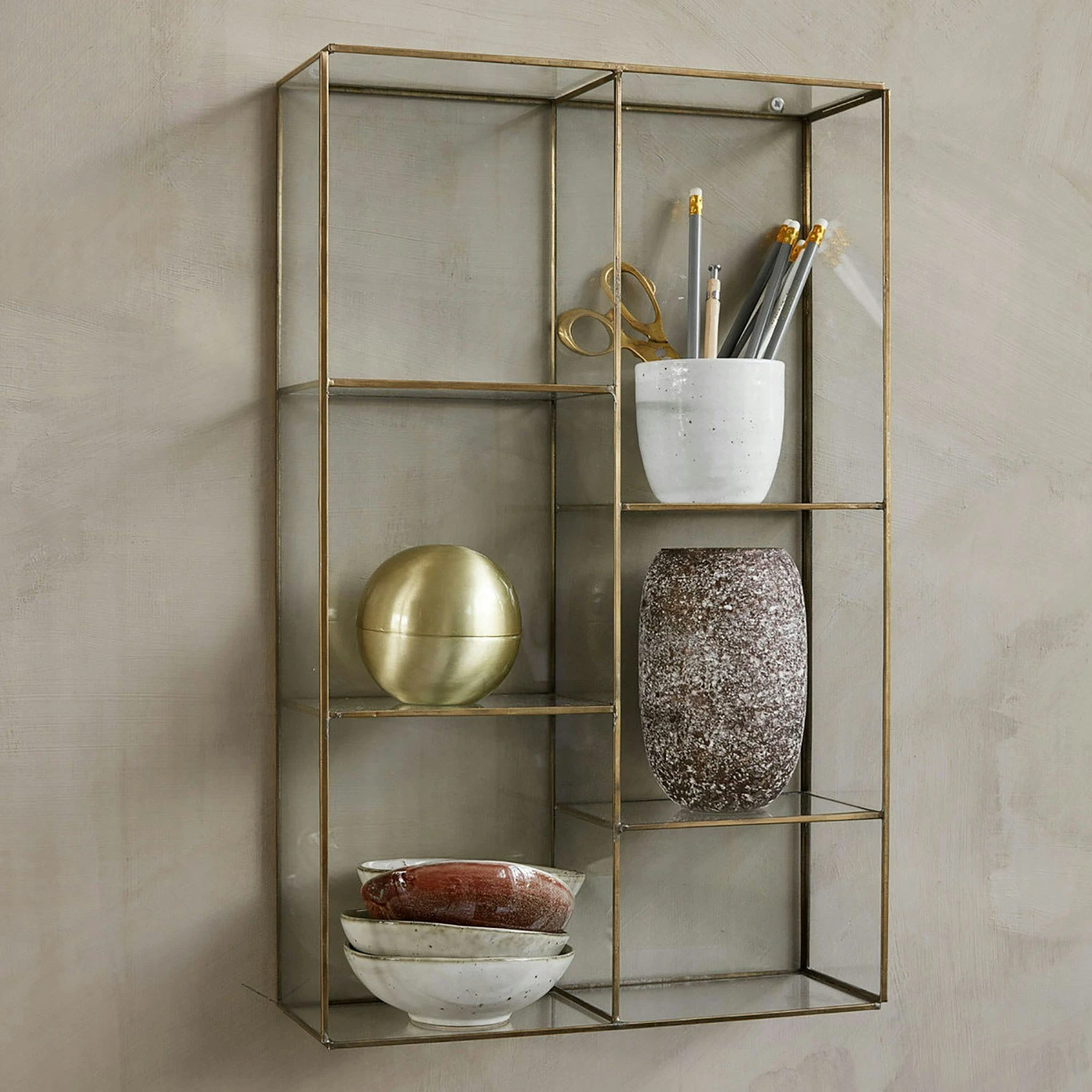 Keeper Shelf from Danish House Doctor. An elegant shelf of brass-plated iron, with walls and shelves of glass. Hang the shelf on the wall and show off your favourite details with style. Fits as well in the bedroom as in the living room or hall. Keeper is also available with 4 compartments.