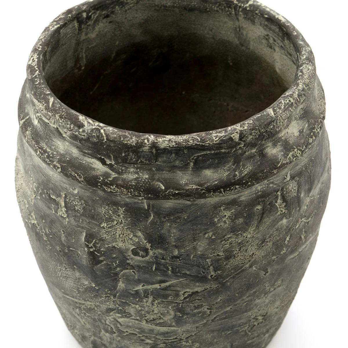 The pot by House Doctor has a handmade design in cement and sand with a beautiful finish. It is oval and has a textured surface with different, black-grey shades and white touches. It has a waterproof inlay in plastic perfect for plants and flowers. Choose between different sizes.