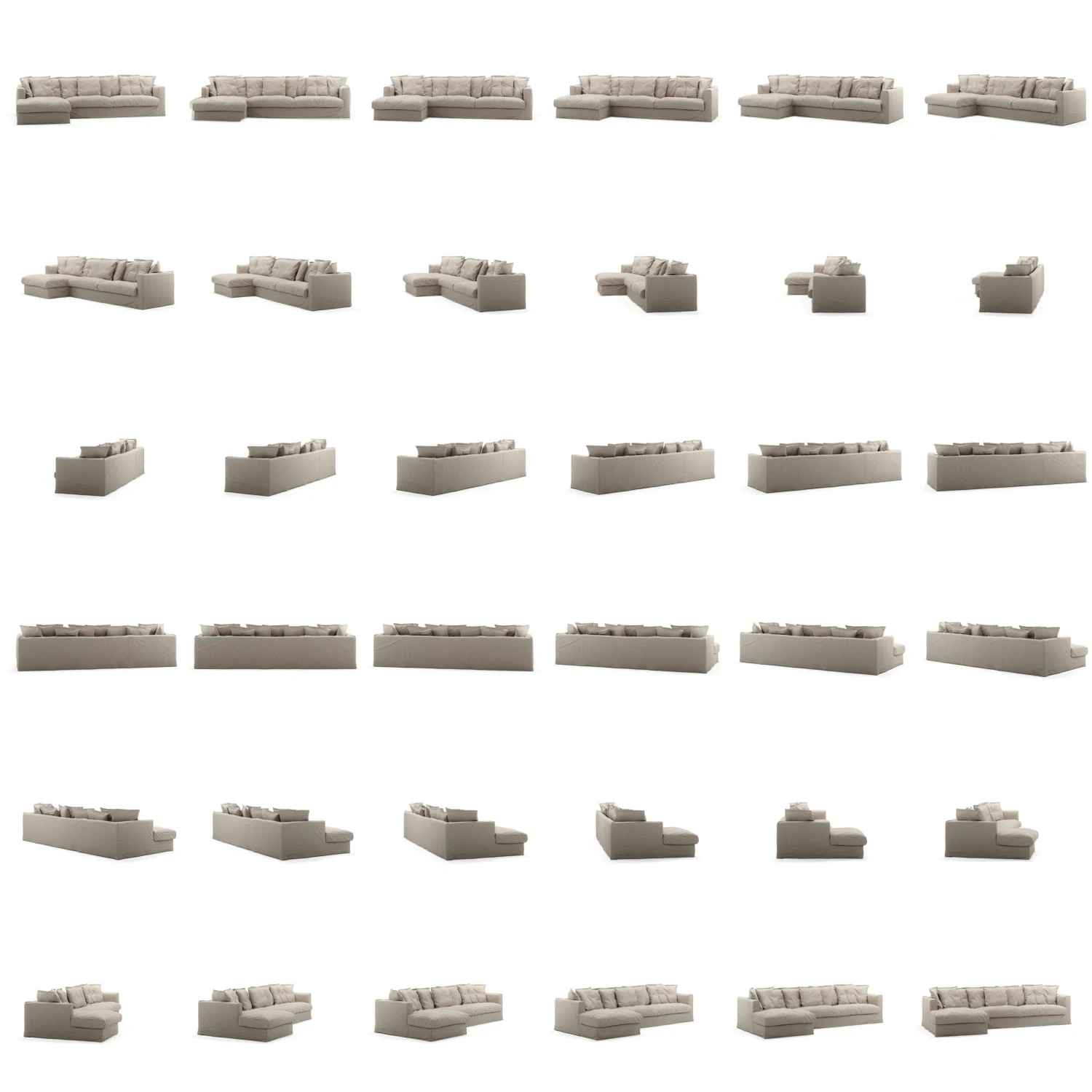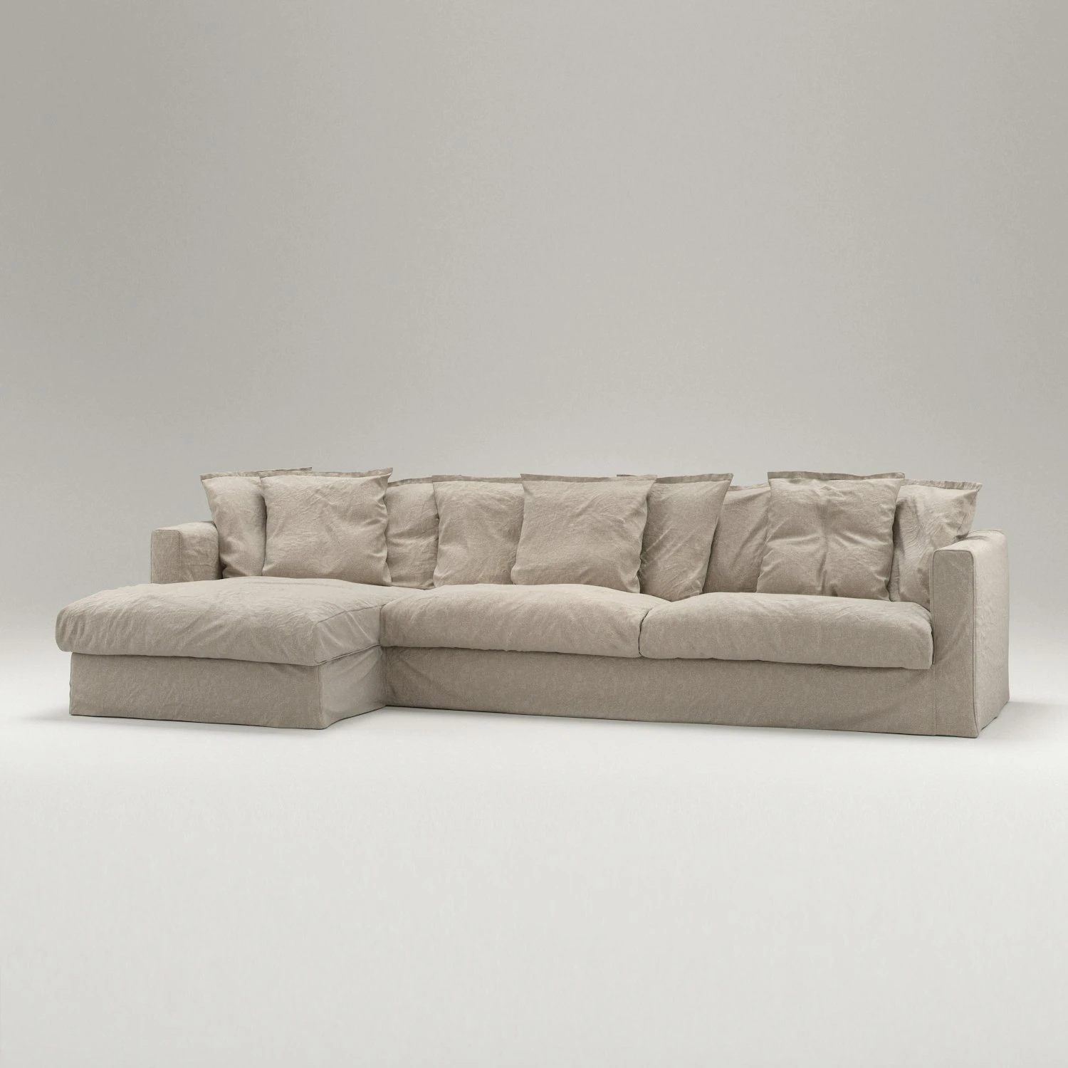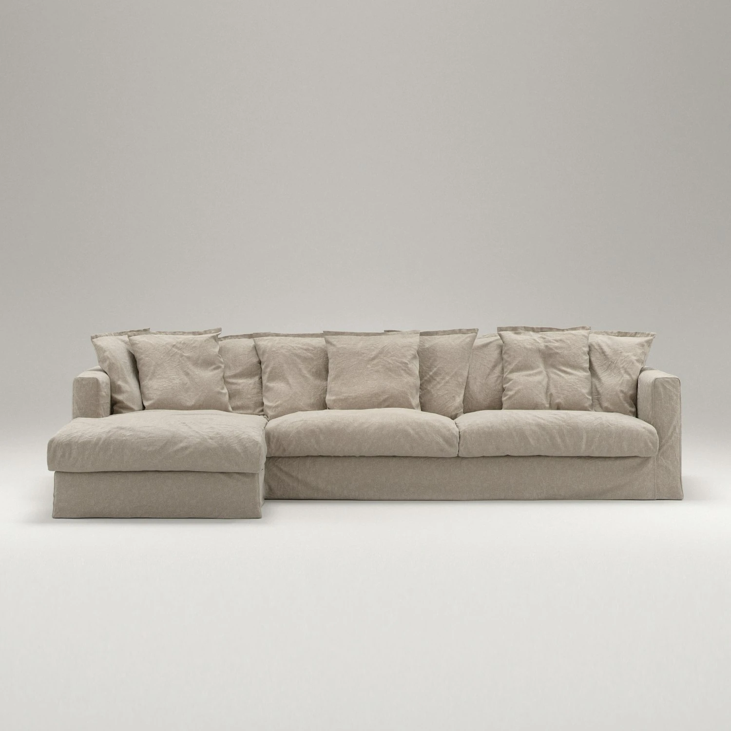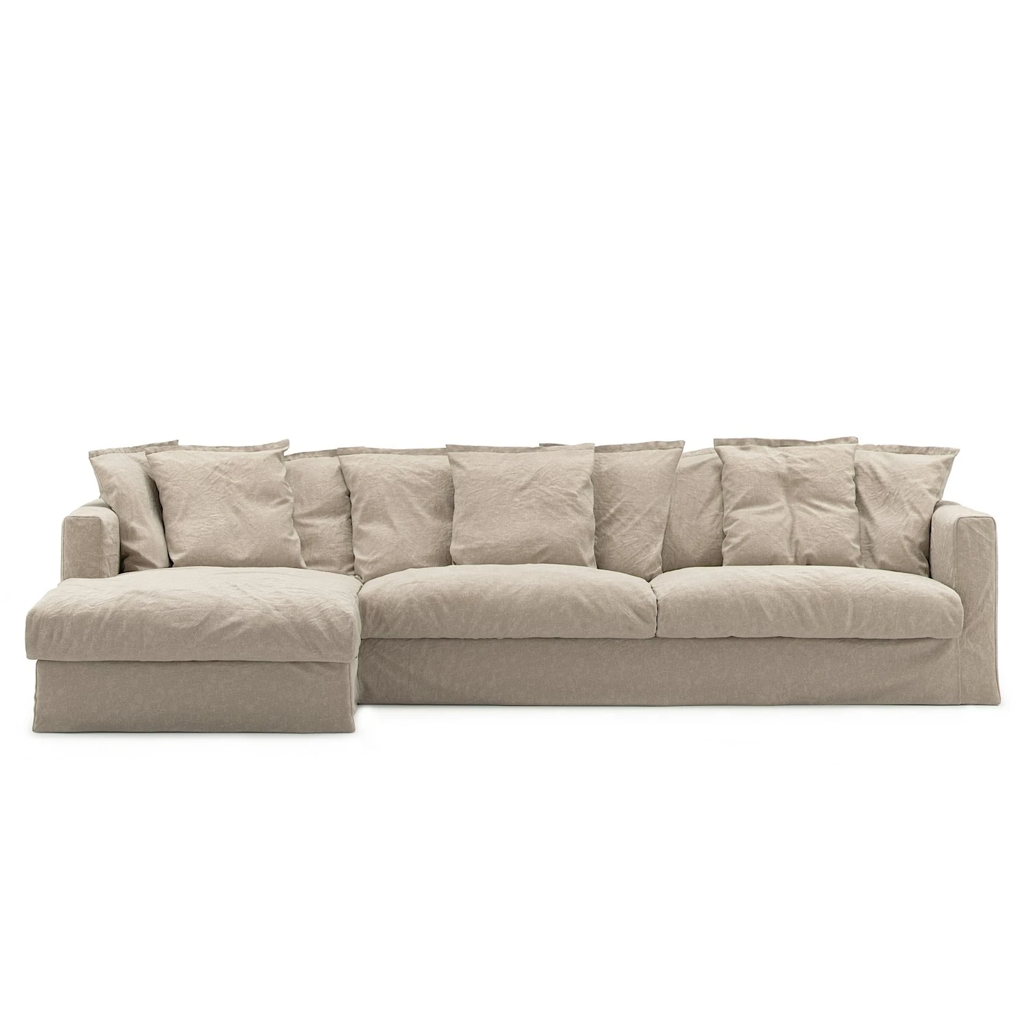 The frame is made of plywood boards with solid wood beams which together provide extra stability and durability. The seat has a core of mold-cut cold foam surrounded by seabird feathers. To keep the shape, the back cushions are sewn in canals and upholstered with a comfortable mix of polyester fiber and seabird feather. The sofa has a loosefit upholstery that is significant with the sofa Le Grand Air. The upholstery is made of 100% linen with a martindale value of 30,000 and can be machine washed at 30 degrees.