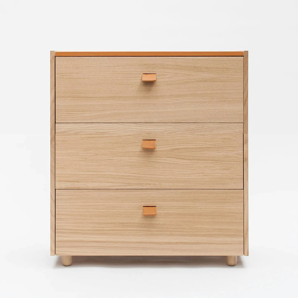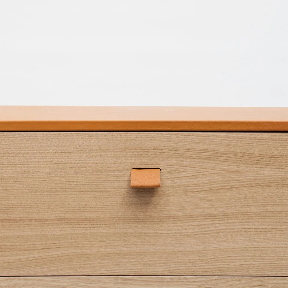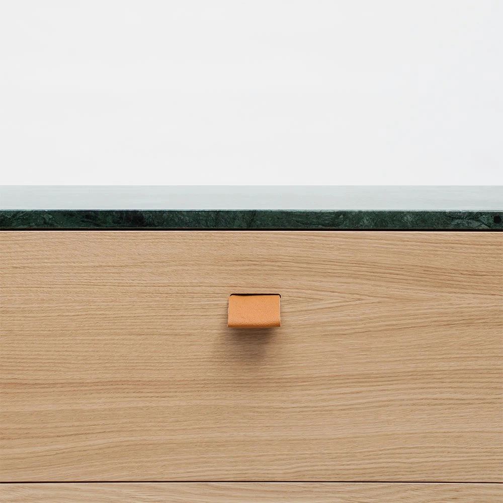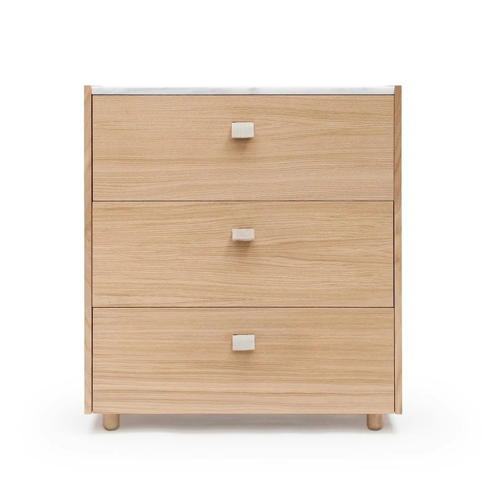 Loft chest of drawers TE3 from Decotique. Loft storing is an elegant range of furniture in classic Scandinavian design with timeless materials. The elegant frame hides drawers in birch plywood. Loft is characterized by the top plate that is available in several versions and for those who wish there is the possibility of getting the version without top plate. The frame is in oak veneer with three drawers that are decorated with handles in beige fabric, the handles give the furniture that little extra unique detail. The top plate is available in several versions and can be changed whenever you wanna change the look.