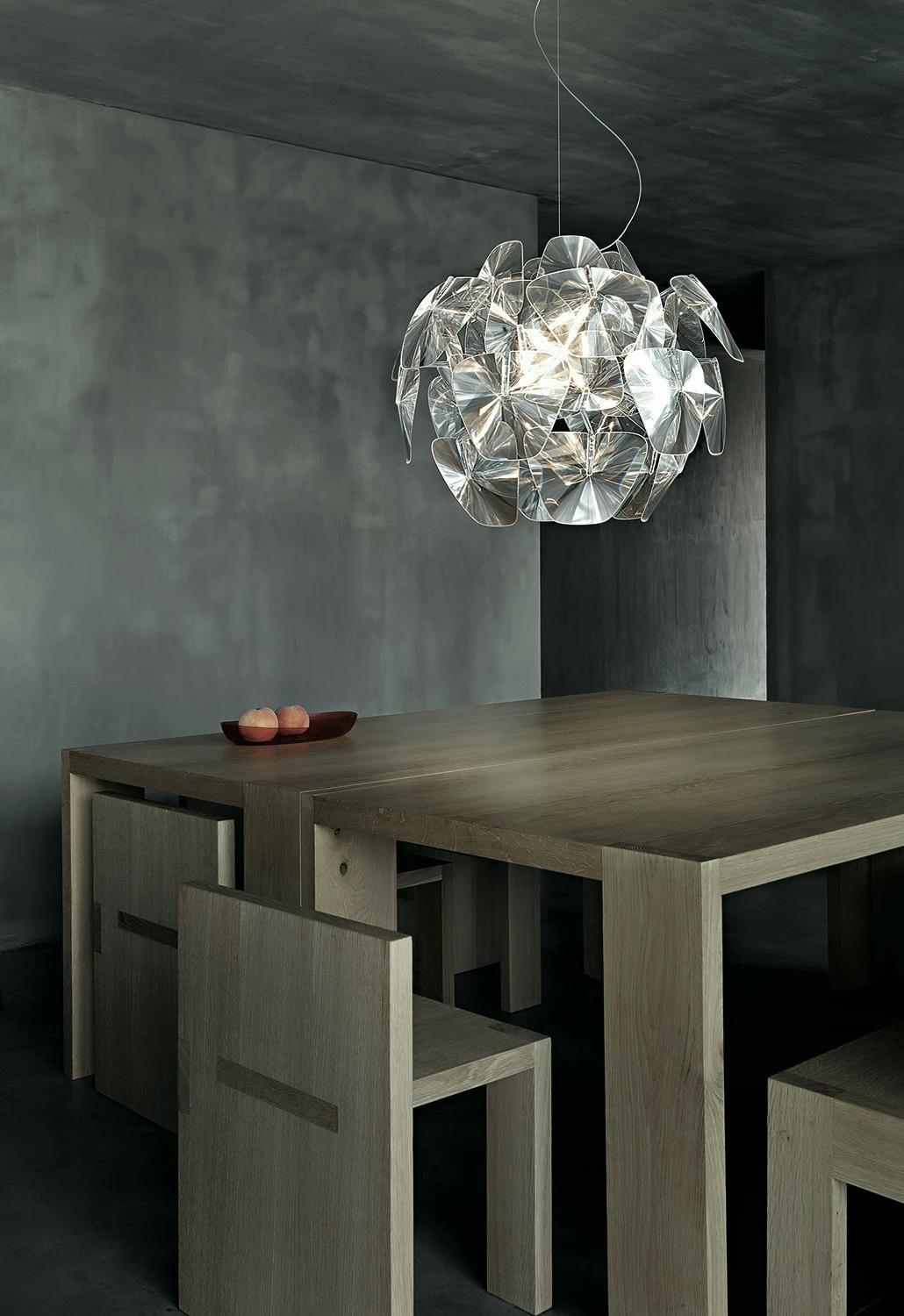 Hope is an award-winning and magic chandelier from Luceplan, designed by Paolo Rizzatto. Hope is no traditional chandelier, it is made of a series of thin Fresnel lenses of transparent polycarbonate that multiply the light from the light source through the room, creating a pleasant glittering shine. Hope has a construction of polished stainless steel and the prismatic lenses are very easy to dismantle.