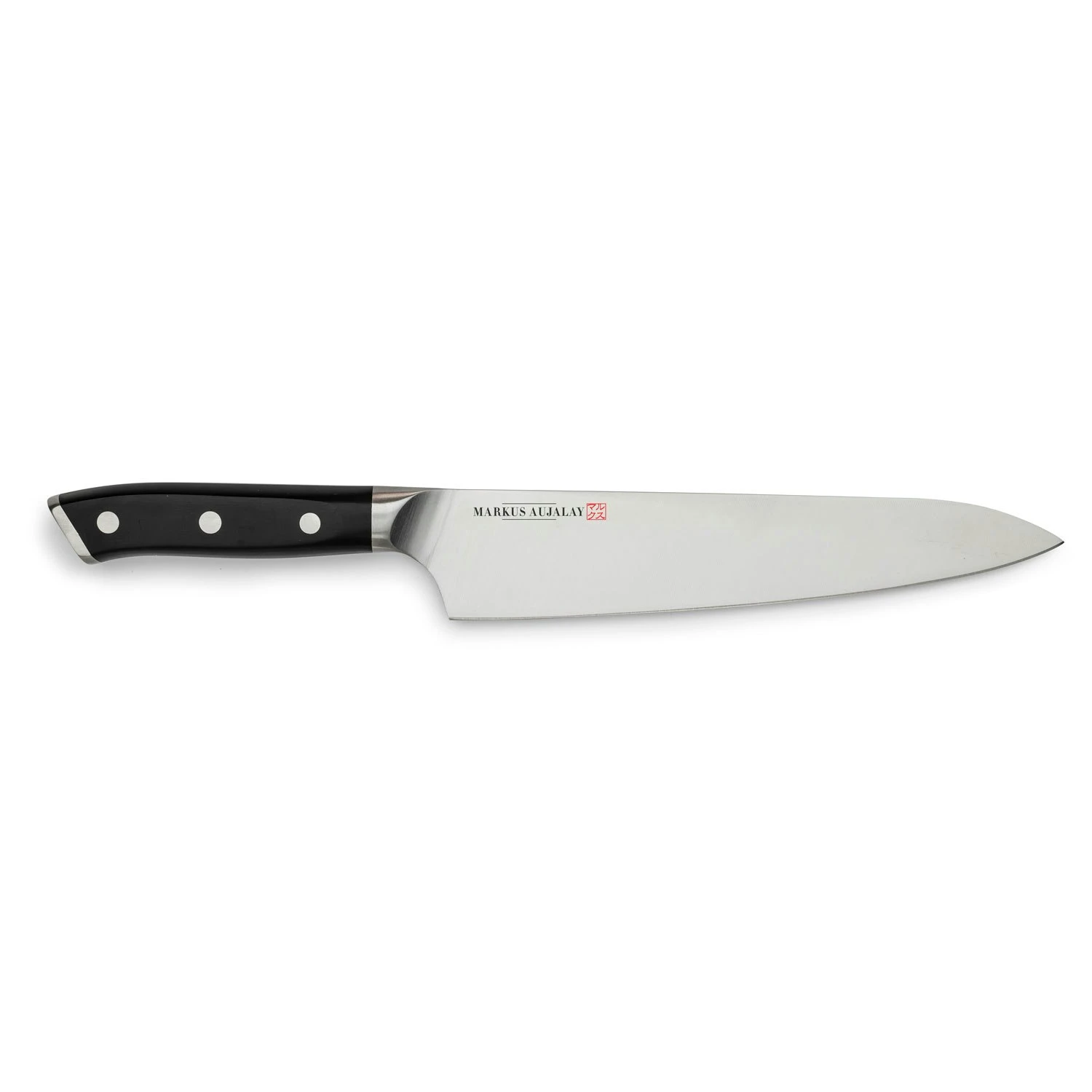The chef knife by Markus Aujalay has a classic, stylish design perfect for any occasion. It has a polished blade with a logo on the side with a black, grip-friendly handle. Delivered in a gift box.