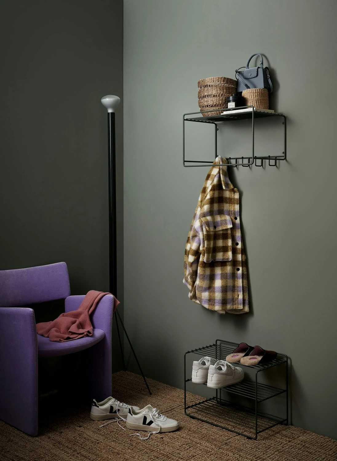 The shoe rack by Maze has a minimalistic, retro-inspired design in powder-lacquered metal perfect for places with limited space. The rack has three practical shelves with good space. The perfect solution for keeping your hallway organized in a timeless and elegant way.
