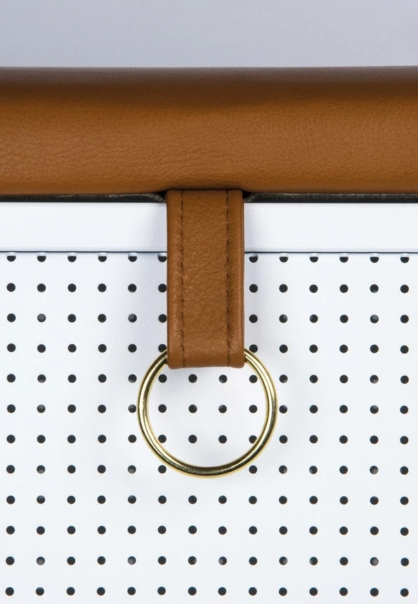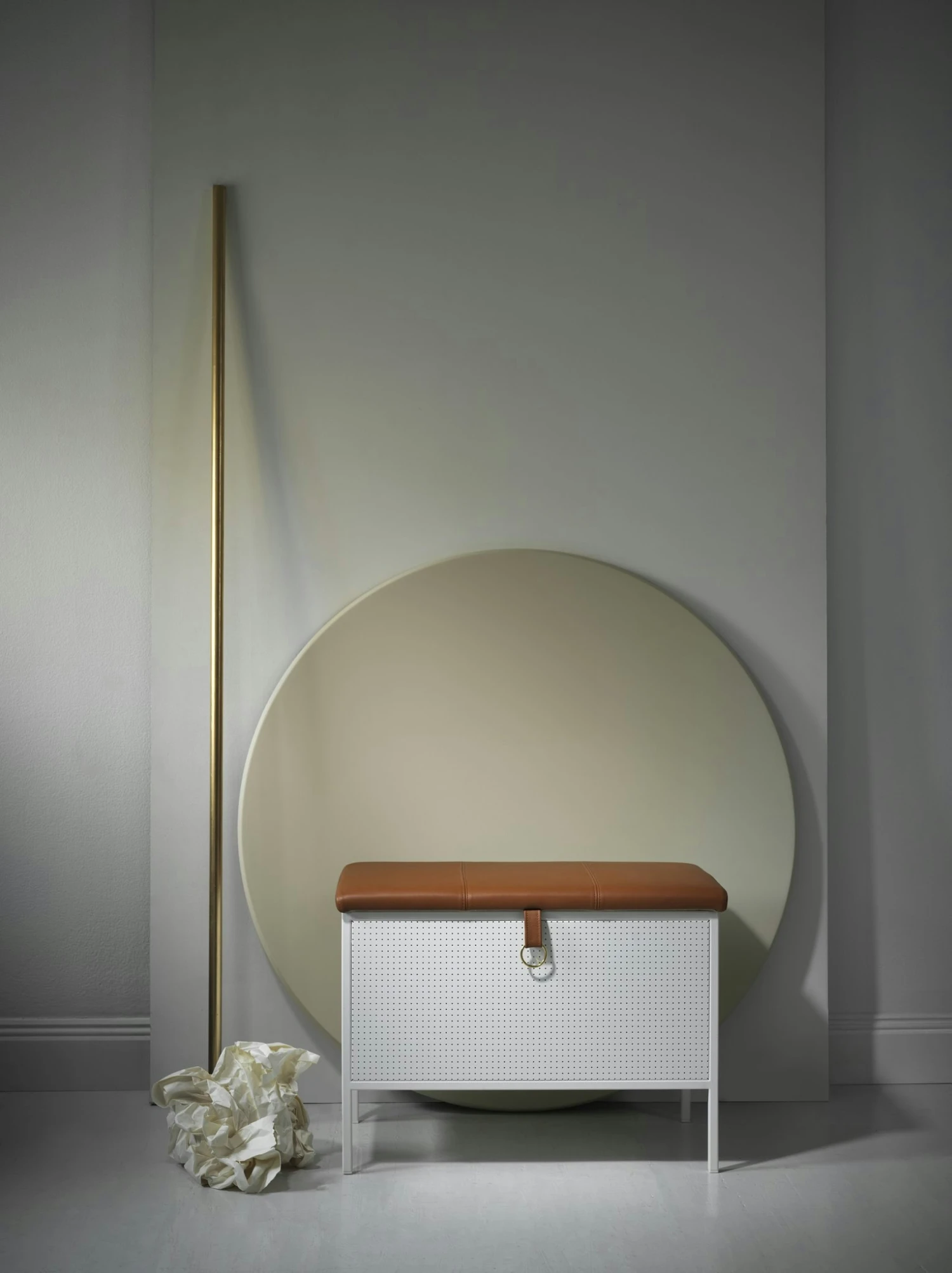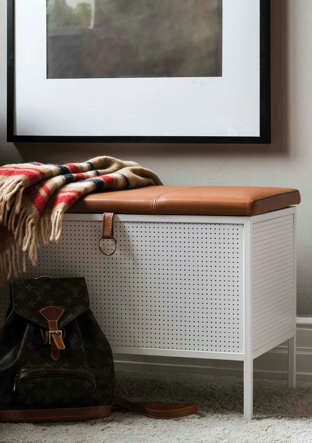 Frank from Design House Stockholm is a neat storage bench for the hall or bedroom. The bench is made of perforated steel with a seat of natural tanned leather from Elmo. Design by Louise Hederström.