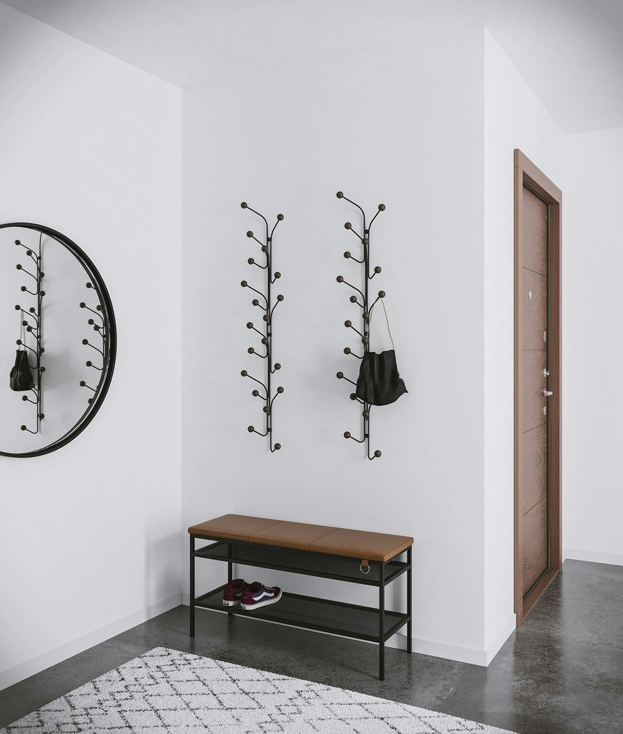 Nancy from Maze, designed by Louise Hederström. A neat, Swedish-made shoe bench with a stylish and classic expression. Made of perforated metal with black or white powder coating and seat of naturally tanned leather from Elmo.