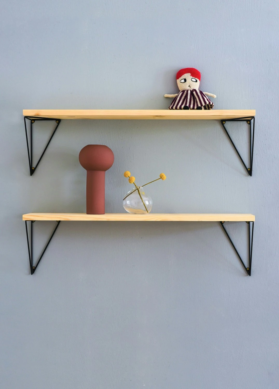 Think freely and place the shelves next to each other and the brackets upside down or vice versa. Paint flowers on the shelves or just plain in one colour. Everything is made from recycled material. The shelves are made of pine and the metal brackets are available in four different colours. For more ideas see PDF.