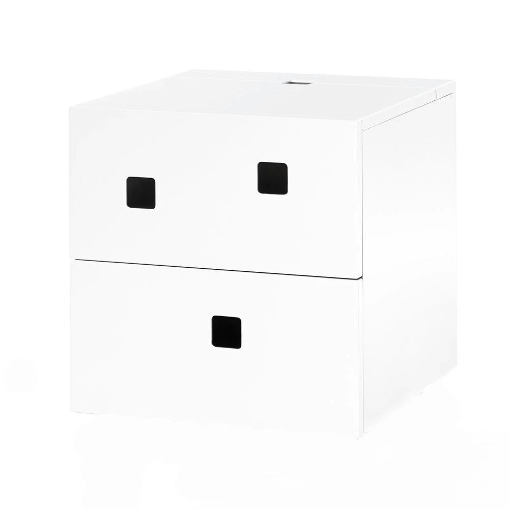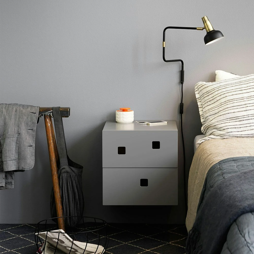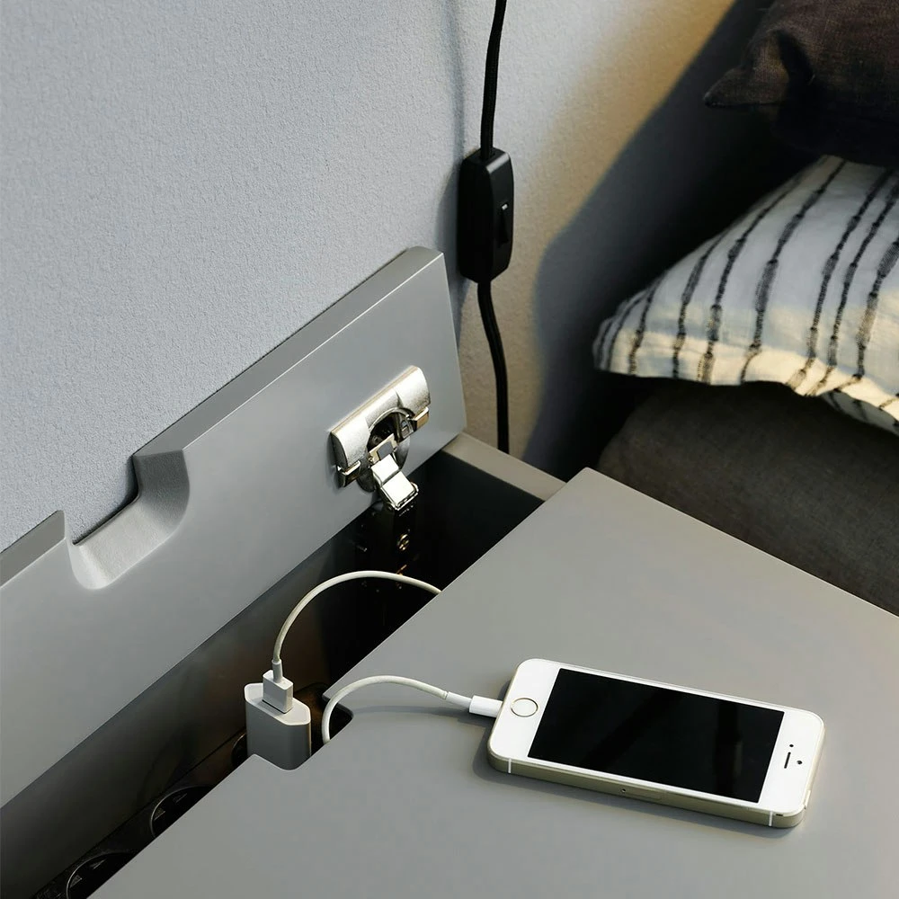 The bedside version of is a discreet cabinet with two drawers and a clever, hidden top hatch for chargers and cables. Choose from several colours. Peep S1 is also available with a legstand of clear or black lacquered oak.