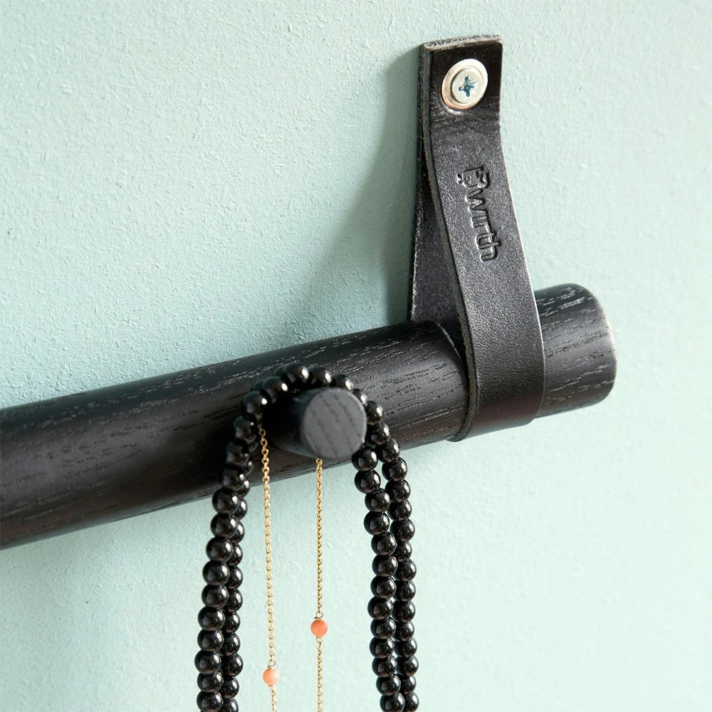 Rack Hooks from by Wirth. Inspired by the classic hanger with classic hooks. Rack is available in two sizes to suit both small and large homes and can be used in both the hall and the bathroom. The leather and rod are stuck together in order to not break under your clothes weight.