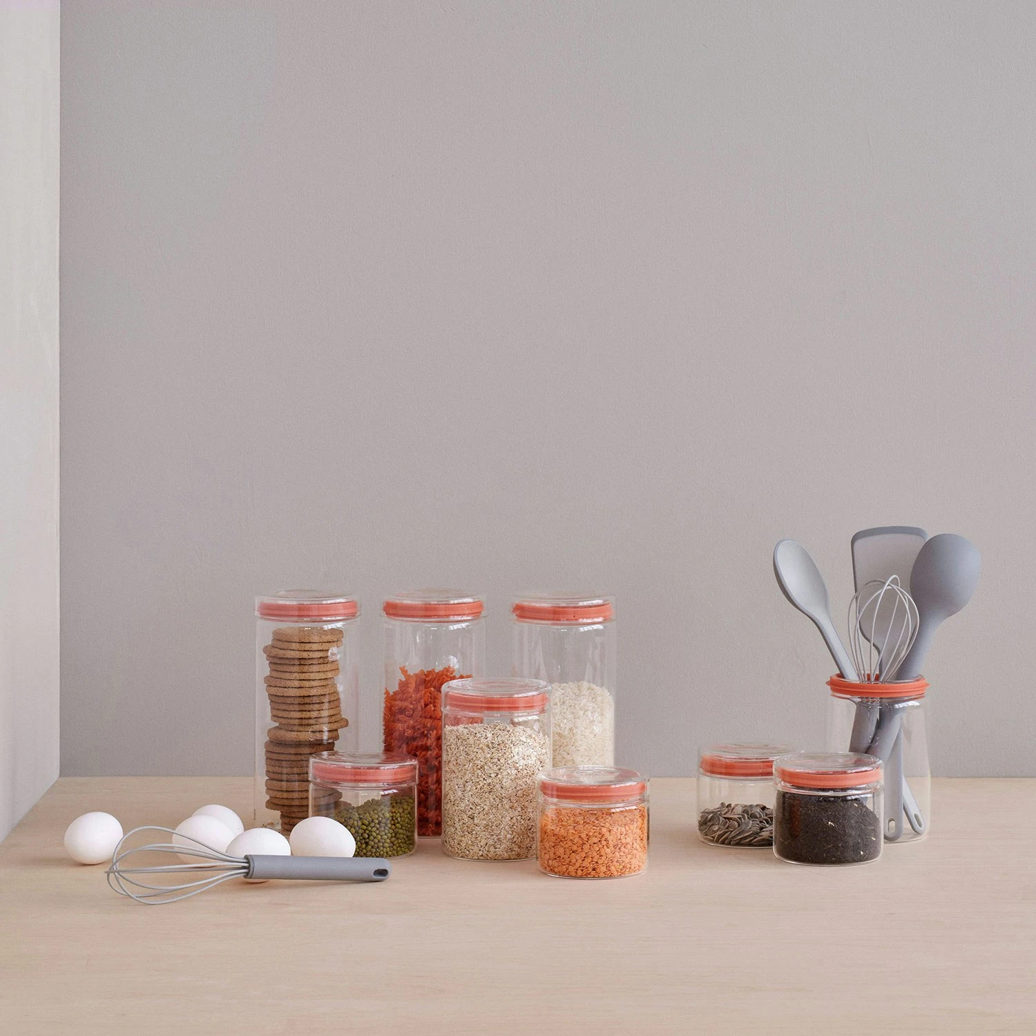 The jar by RIG-TIG by Stelton has a stylish appearance in clear glass with a tight-fit lid in silicone. It has a user-friendly design for easy storage.