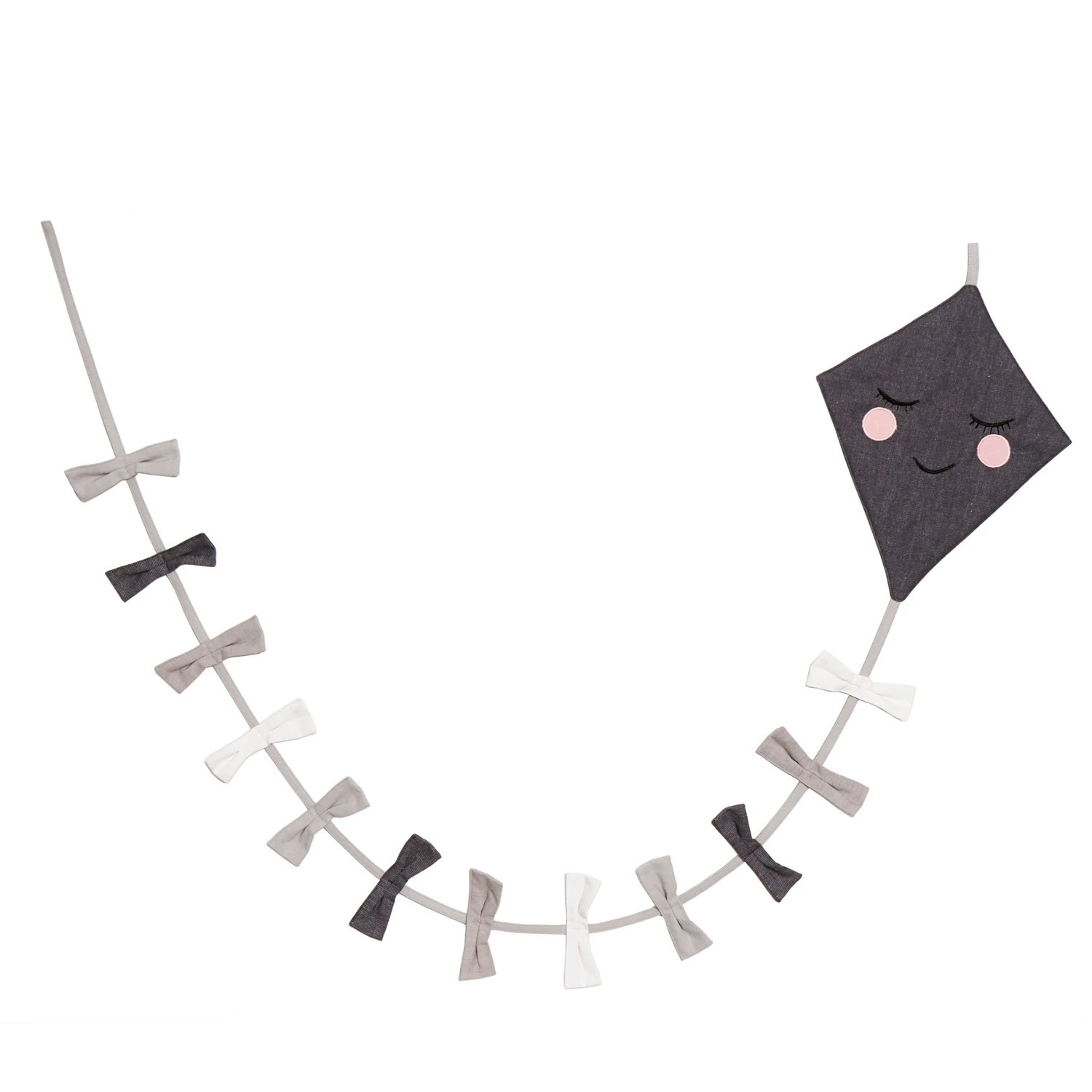 Cute decoration garland from Roommate. The garland has been shaped like a dragon and has been decorated with several bows in different colours along the tail. The flying kite is 185 cm long and is offered in two different designs, pastel color and black and white.