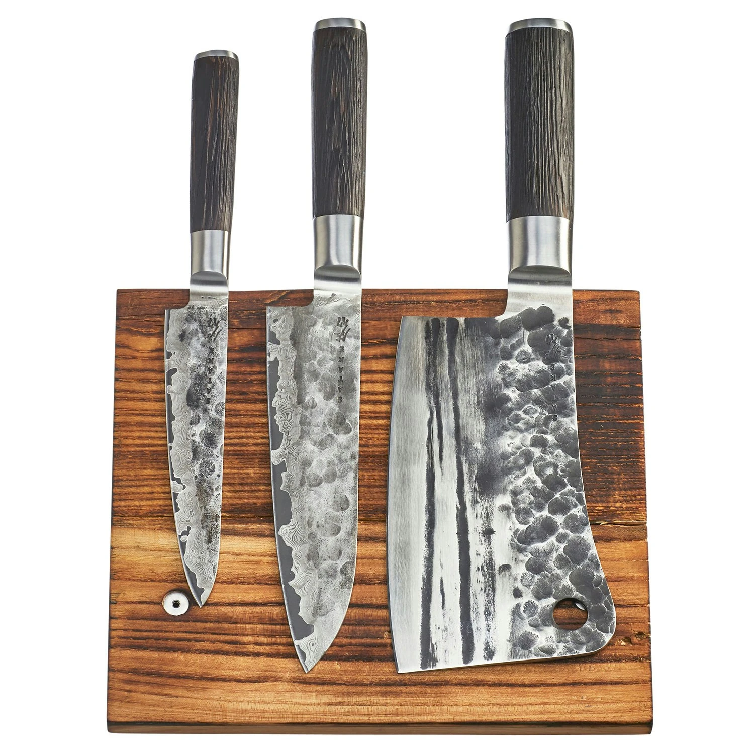 Satake magnetic knife board in rustic and robust wood design. Made of burnt wood with magnetic function. Capacity for up to 5 knives. Dimensions: 25×22 cm.