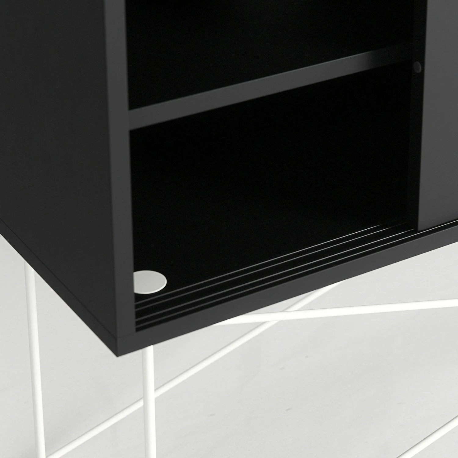 The TV bench is available in two different sizes, this shorter variant is 136 centimeters with two sliding doors while the bigger one is 180 centimeters with three gaps. There is an adjustable shelf inside each compartment and also an opening at the back where cables can be pulled through and hidden on the back. The bench stands firmly on a 35-centimeter tall stand in brass alternatively white or black painted metal.
