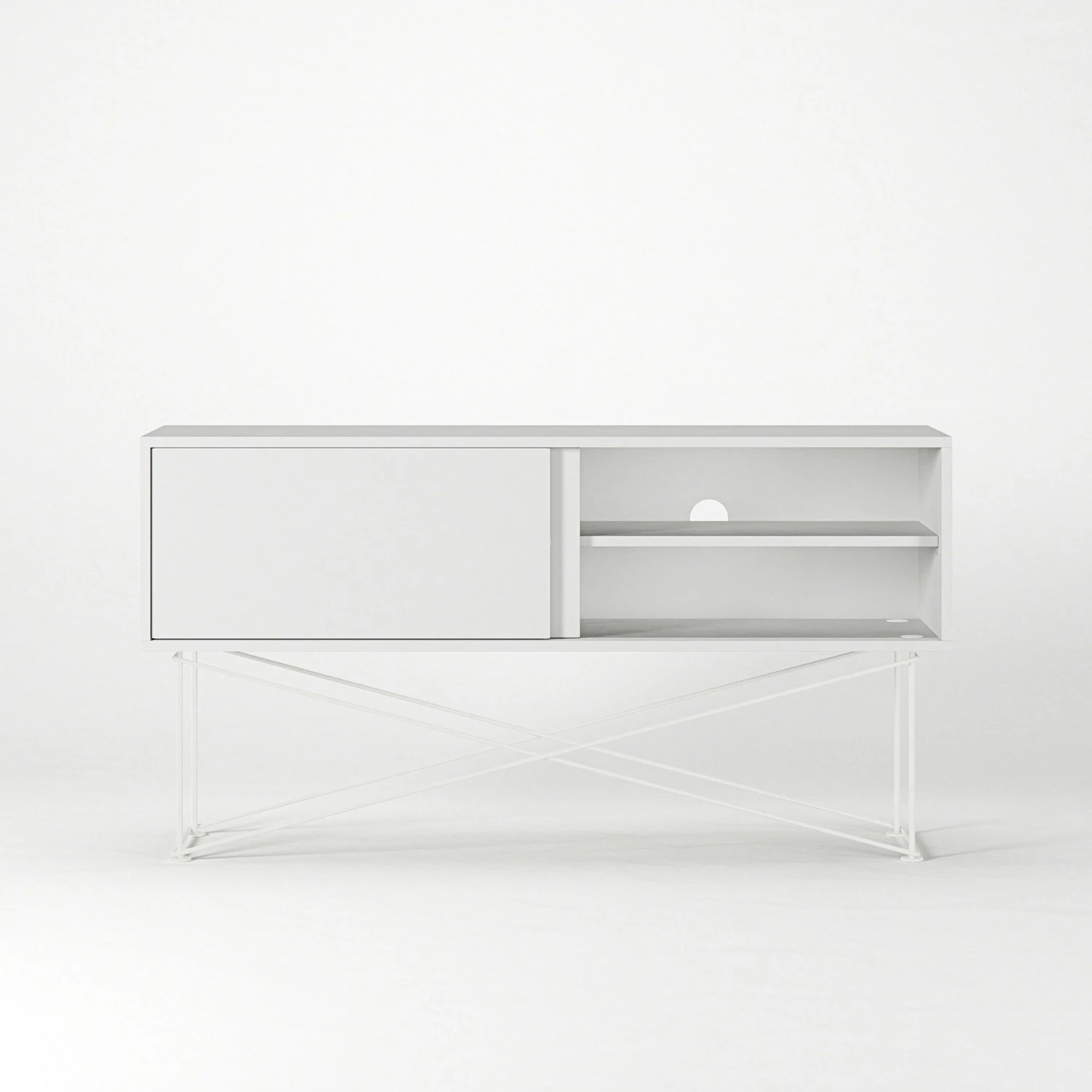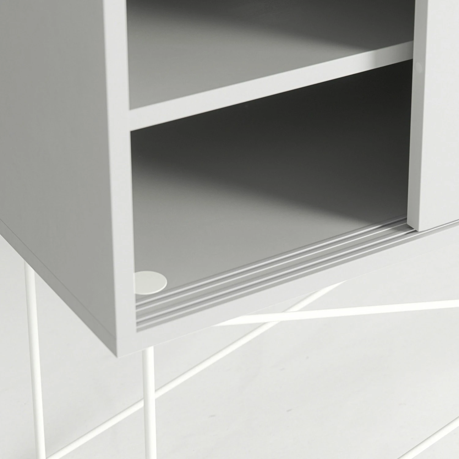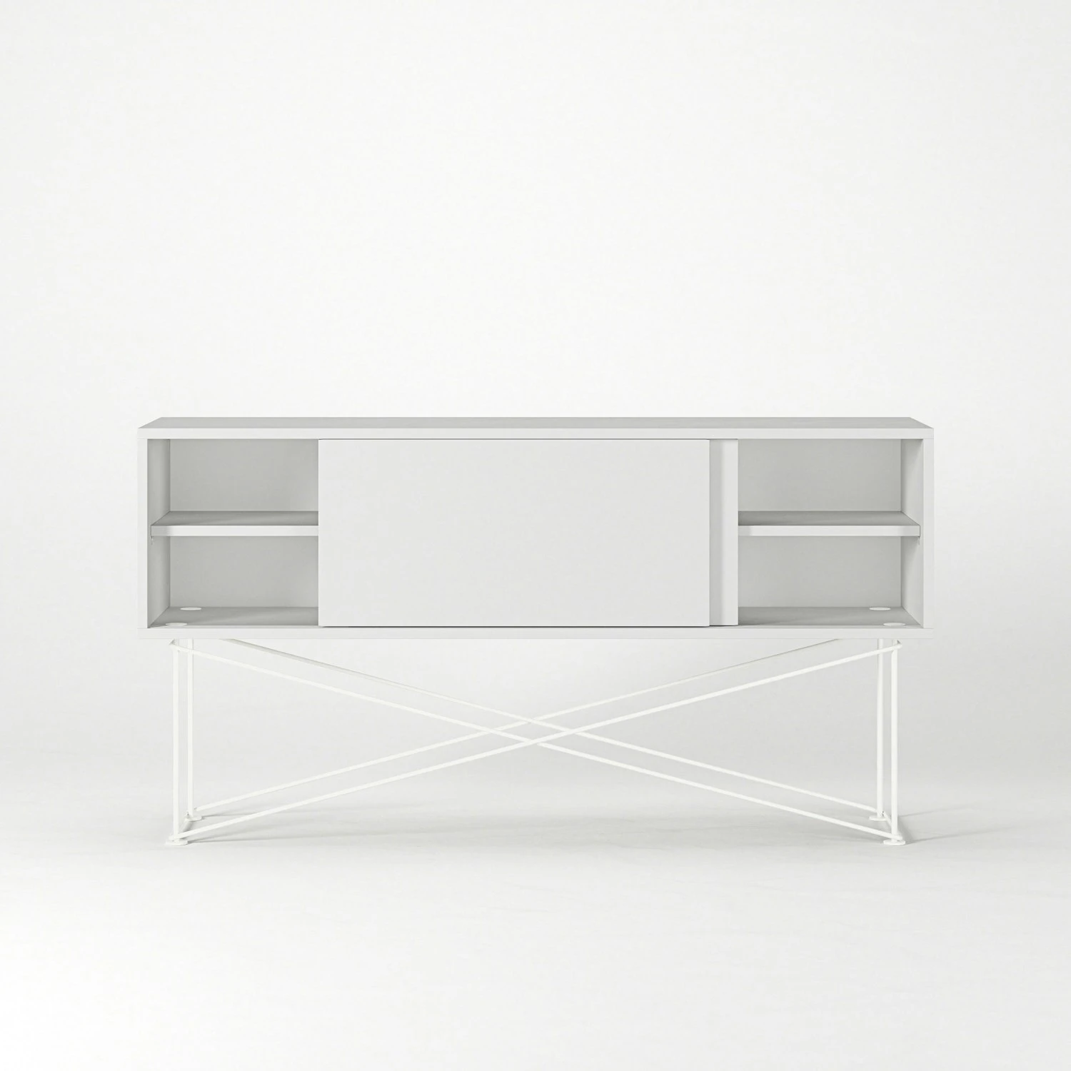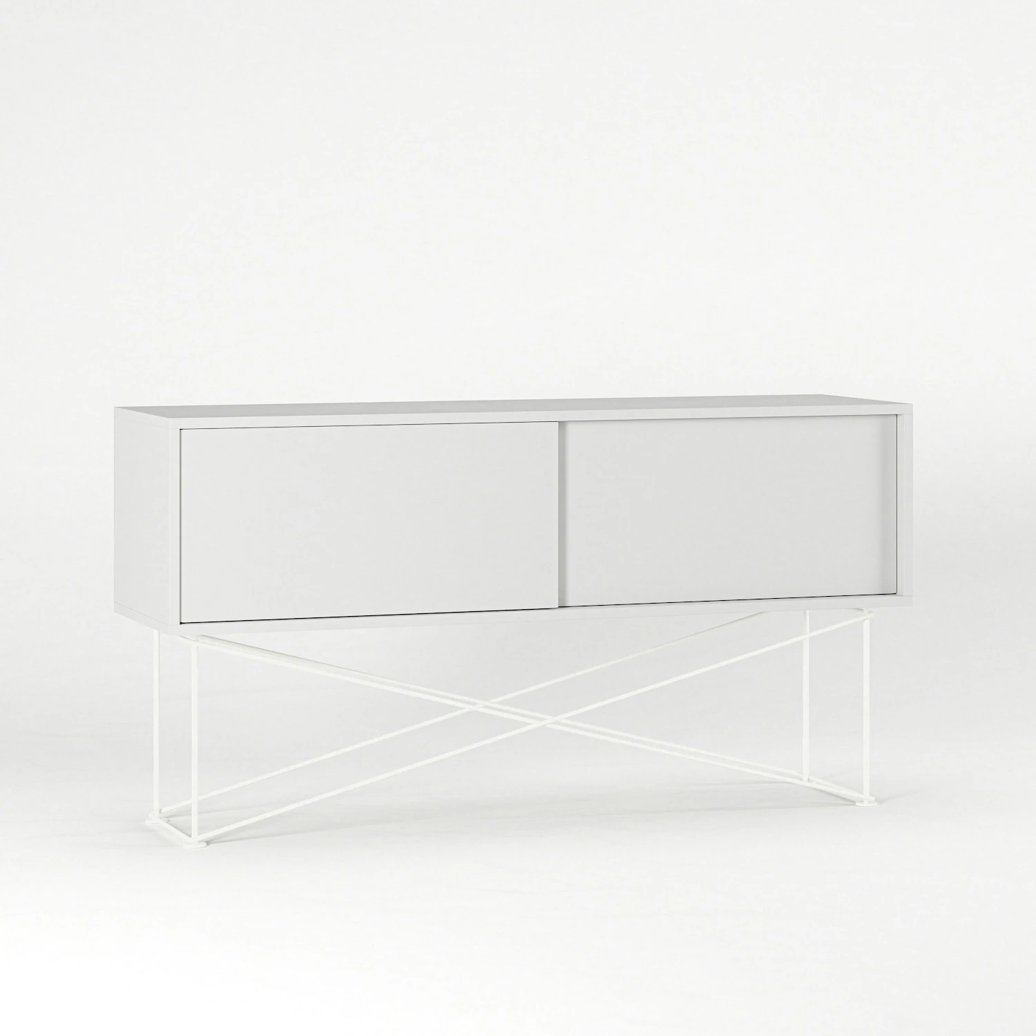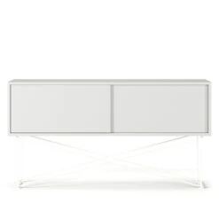 The TV bench is available in two different sizes, this shorter variant is 136 centimeters with two sliding doors while the bigger one is 180 centimeters with three gaps. There is an adjustable shelf inside each compartment and also an opening at the back where cables can be pulled through and hidden on the back. The bench stands firmly on a 35-centimeter tall stand in brass alternatively white or black painted metal.