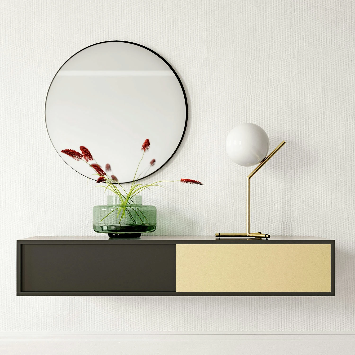 - Frame made of painted MDF, sliding doors in brass-coloured aluminium and/or painted MDF and cleaned with a damp cloth